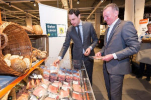 Op verzoek van Albert Heijn was onze directeur Frank Dales vandaag graag bereid om samen met staatssecretaris Martijn van Dam de eerste varkensvleeswaren met een ster van het Beter Leven keurmerk in de schappen van de supermarkt in Leidschendam te leggen. De handeling markeert een belangrijke omschakeling, want de supermarkt wil eind dit jaar alle varkensvleeswaren hebben voorzien van het keurmerk van de Dierenbescherming.