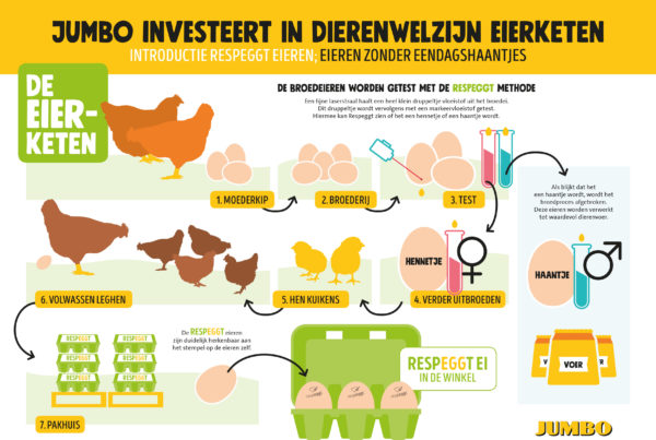 Co’tje Admiraal, algemeen directeur/bestuurder van de Dierenbescherming is enthousiast dat deze innovatieve methodiek nu in de praktijk wordt toegepast. “ Het voortijdig kunnen signaleren van de sekse van een broedei is een unieke stap richting een beter dierenwelzijn. De Dierenbescherming heeft het altijd als zeer pijnlijk ervaren dat haantjes direct gedood worden als ze ter wereld komen. Dat er nu een oplossing komt voor vergassing van de haantjes is een fantastische stap. Dat Jumbo deze innovatieve samenwerking is aangegaan juichen wij van harte toe en we hopen dat andere retailers het voorbeeld volgen”.