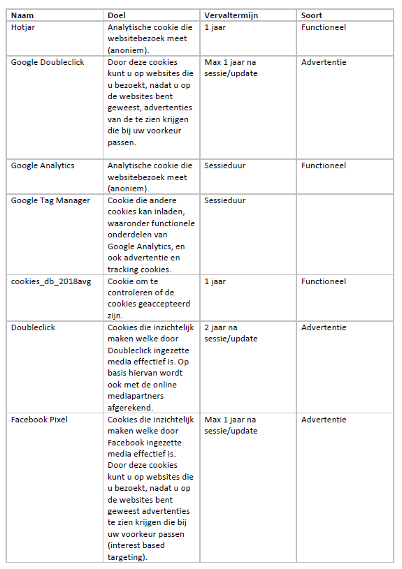 Op deze websites kun je toestemming geven voor het plaatsen van deze cookies. Bekijk hieronder welke (verschillende) cookies geplaatst worden op onze websites.