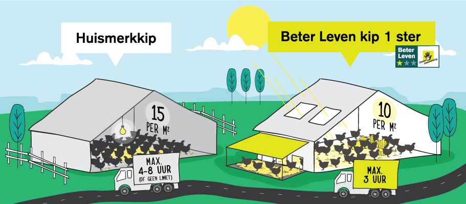Tussen de huismerkkippen van de verschillende supermarkten zijn wel enkele verschillen op het gebied van dierenwelzijn. De Nieuwe Standaard Kip van Jumbo komt het dichtst in de buurt van Beter Leven keurmerk 1 ster. Maar op belangrijke punten, zoals ruimte en toegang tot een overdekte uitloop, schieten de huismerkkippen tekort. Wie dus stappen wil zetten op het gebied van diervriendelijker consumptie eet sowieso minder vlees en minimaal met één ster van het Beter Leven keurmerk.